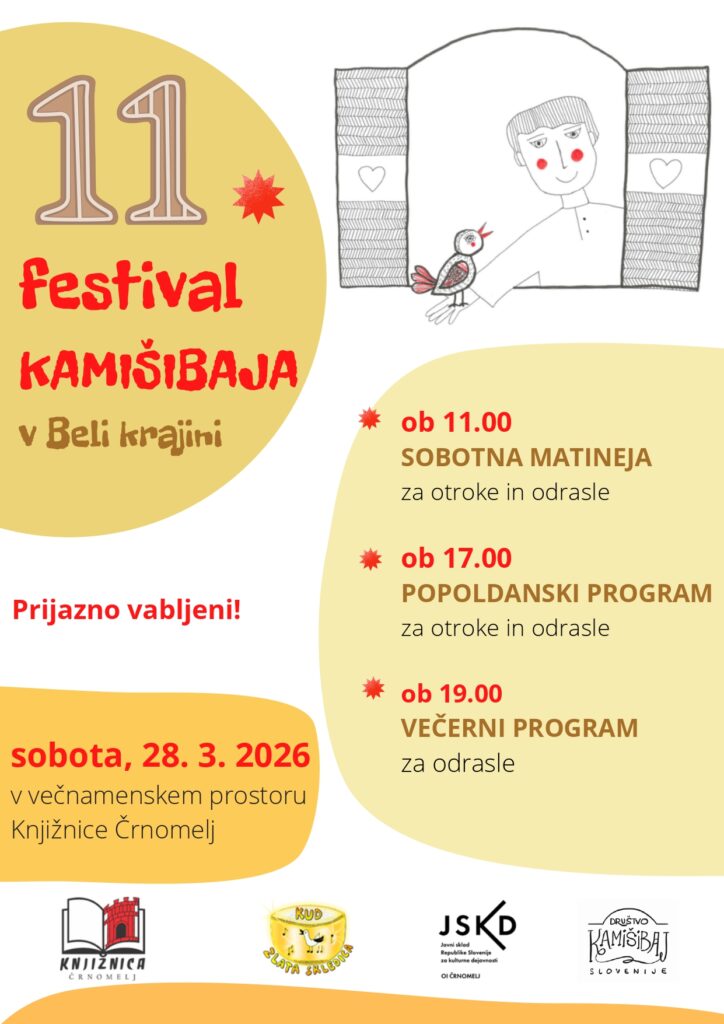 Črnomelj Festival kamišibaja v Beli krajini - Črnomelj Festival kamišibaj gledališča v Beli krajini poteka od leta 2015. V KUD Zlata skledica ga vsakoletno organizirajo v aprilu. Za več informacij se obrnite na Bredo Kočevar breda.kocevar@crn.sik.si in na Darkota Kočevarja kavadarko@gmail.com.